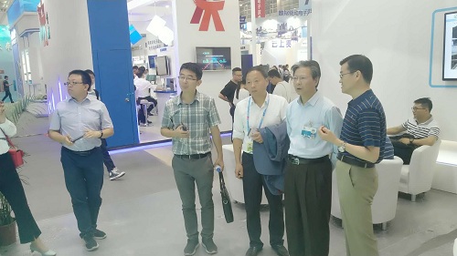 图为展会现场生态环境部信息中心章少民主任、规划发展室李顺主任、福建省环境信息中心蔡旺华总工参观青海展区