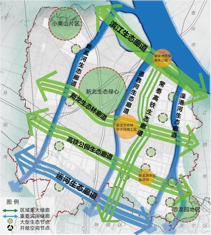 近年来,新北区强化“山水林田湖草沙”等多生态要素协同治理,持续做好生态绿城建设,实施小黄山、新孟河等重点区域生态系统保护与修复工程,优化完善以长江、运河、藻江河等为骨架的“四横四纵”生态廊道构建,连通城市公园和生态片林,让绿色生态元素覆盖全域。全域绿网的顶层设计增加了生态系统稳定性,形成风道与动物迁徙通道,为营造宜居环境、保护生物种群生存和繁衍打下坚实基础。