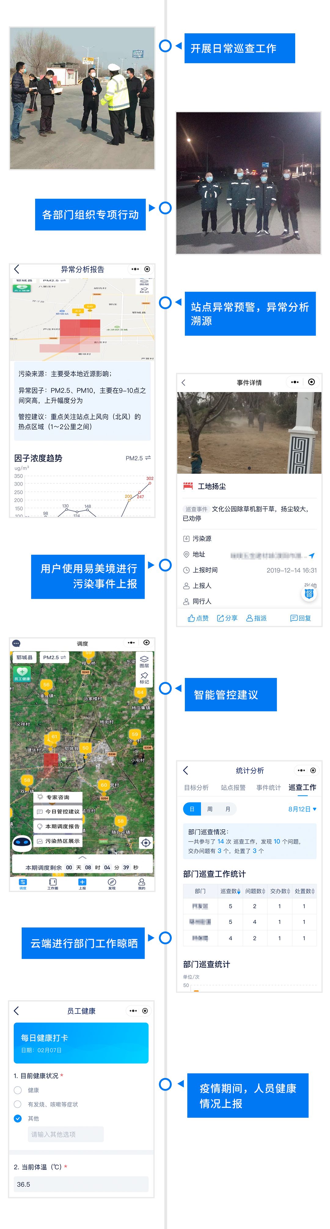 创新服务,全力以赴驰援一线基层工作。投身防控疫情一线是践行初心使命的磨刀石、体现责任担当的试金石,打赢疫情防控阻击战是当前最大的政治任务。为保障疫情期间广大基层环保人员的身体健康,中心积极引入“互联网+疫情防控”模式,通过面向市、县、乡镇 “协同管控线上服务平台”,为奋战在一线的环保人员和社区工作者提供跨层级、多部门参与的线上协同办公环境,实现预警预报、污染溯源、来源解析措施评估等数据分析功能以及监控调度、智能上报、线上反馈等智能管控服务,助力打赢疫情防控、污染防治两大战役。