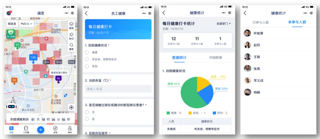 健康管理,全力动员构筑疫情防控屏障。为加强疫情期间工作人员的健康管理,全面掌握在职职工健康状况,确保疫情过后人人都能安心复工返岗,中心充分发挥互联网在疫情研判、人员健康管理等方面的支撑作用,开启线上云服务,通过记录人员健康状况、接触感染源、行程和位置等信息,实现手机每日打卡、健康状况申报、智能监控等功能,有效帮助各部门进行疫情防控,为局职工和家属健康保驾护航。