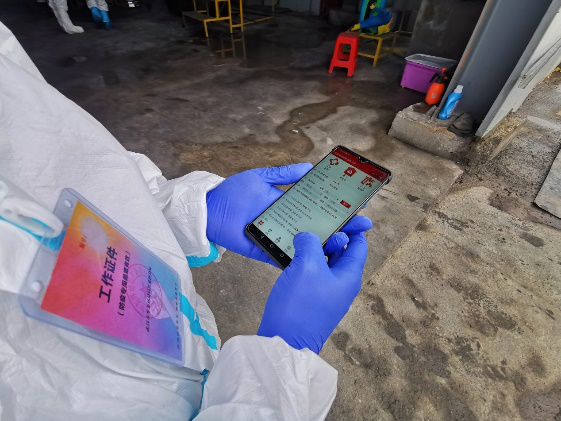 工作人员正在雷神山医院医疗废物处置间使用“武汉医废通APP”