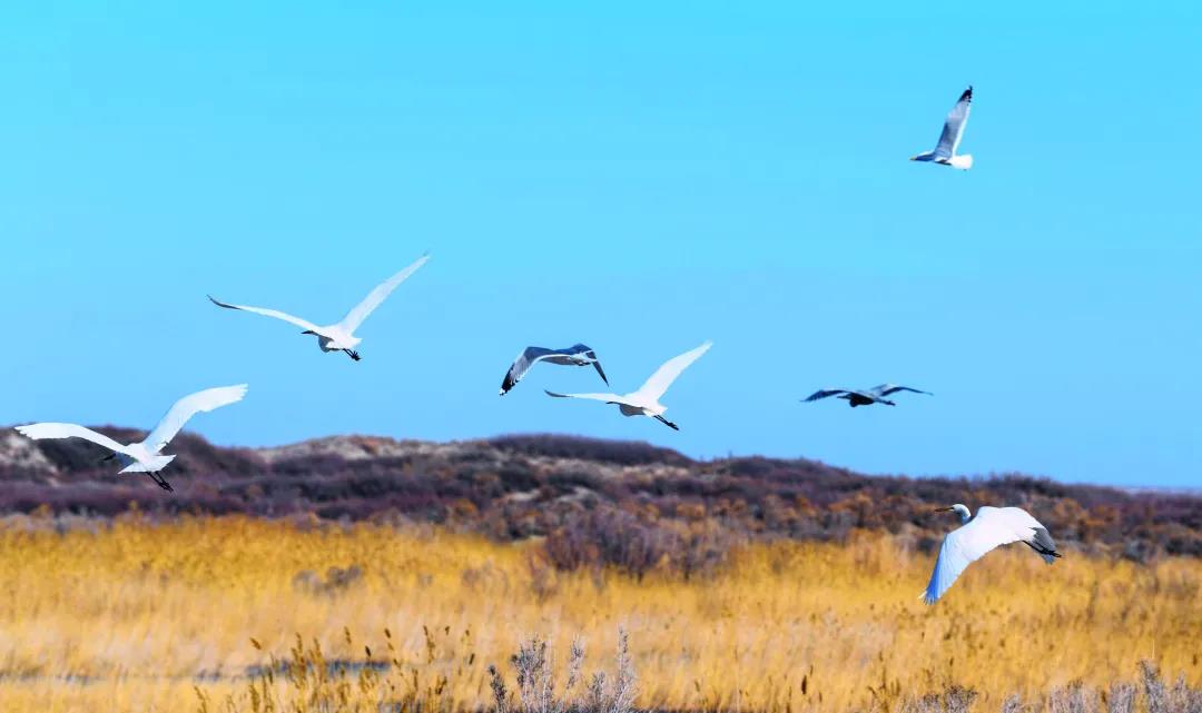3月28日,水鸟在新疆阿勒泰地区福海县乌伦古湖国家级湿地公园内飞翔。
