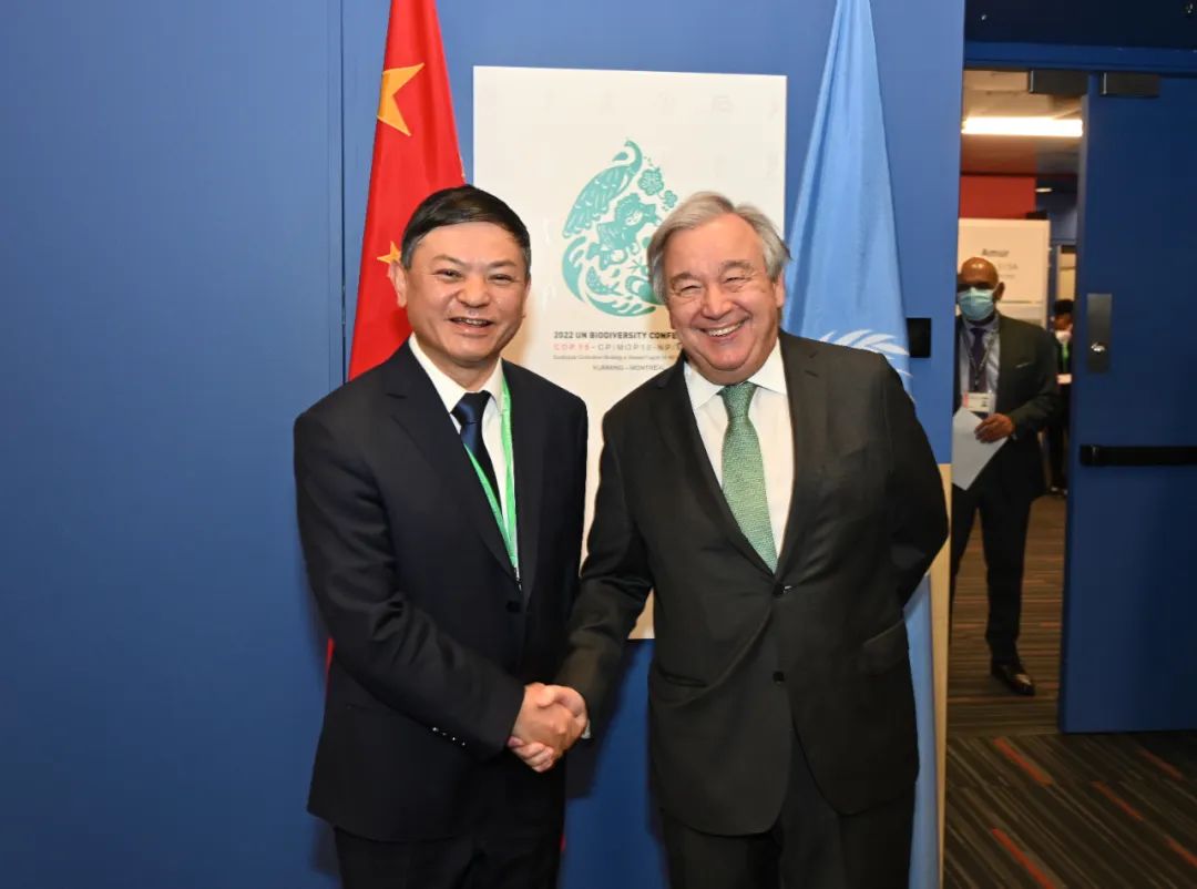 《生物多样性公约》第十五次缔约方大会(COP15)主席、生态环境部部长黄润秋会见联合国秘书长古特雷斯