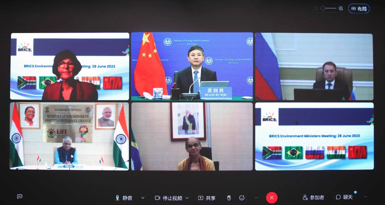 6月28日,第九次金砖国家环境部长会议以视频形式召开。会议以“推进金砖国家环境合作,实现2030年可持续发展议程”为主题。生态环境部部长黄润秋出席会议、致开幕辞并作主题发言。会议由南非环境、森林和渔业部部长芭芭拉·克里西主持。巴西环境与气候部部长玛丽娜·席尔瓦,俄罗斯自然资源与生态部部长亚历山大·科兹洛夫,印度环境、森林和气候变化部部长布潘德尔·亚达夫出席会议并发言。