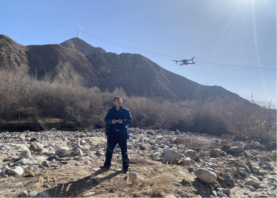 2023年12月,中央第五生态环境保护督察组在海南州使用无人机现场检查小水电站生态流量情况