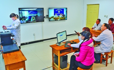 在石家庄市平山县西柏坡乡卫生院,北京大学人民医院的医生(画面左边屏幕)通过“远程医疗会诊平台”,为老区患者会诊。新华社发