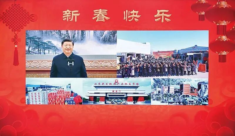 2023年1月18日,中共中央总书记、国家主席、中央军委主席习近平在北京通过视频连线看望慰问基层干部群众,向全国各族人民致以新春的美好祝福。这是习近平通过视频连线,同北京新发地农产品批发市场的商户和采购年货的群众亲切交流。