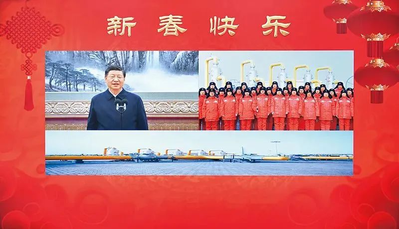 2023年1月18日,中共中央总书记、国家主席、中央军委主席习近平在北京通过视频连线看望慰问基层干部群众,向全国各族人民致以新春的美好祝福。这是习近平通过视频连线,同塔里木油田公司轮南油气储运中心西气东输第一站克拉集气区员工亲切交流。新华社记者 李涛/摄