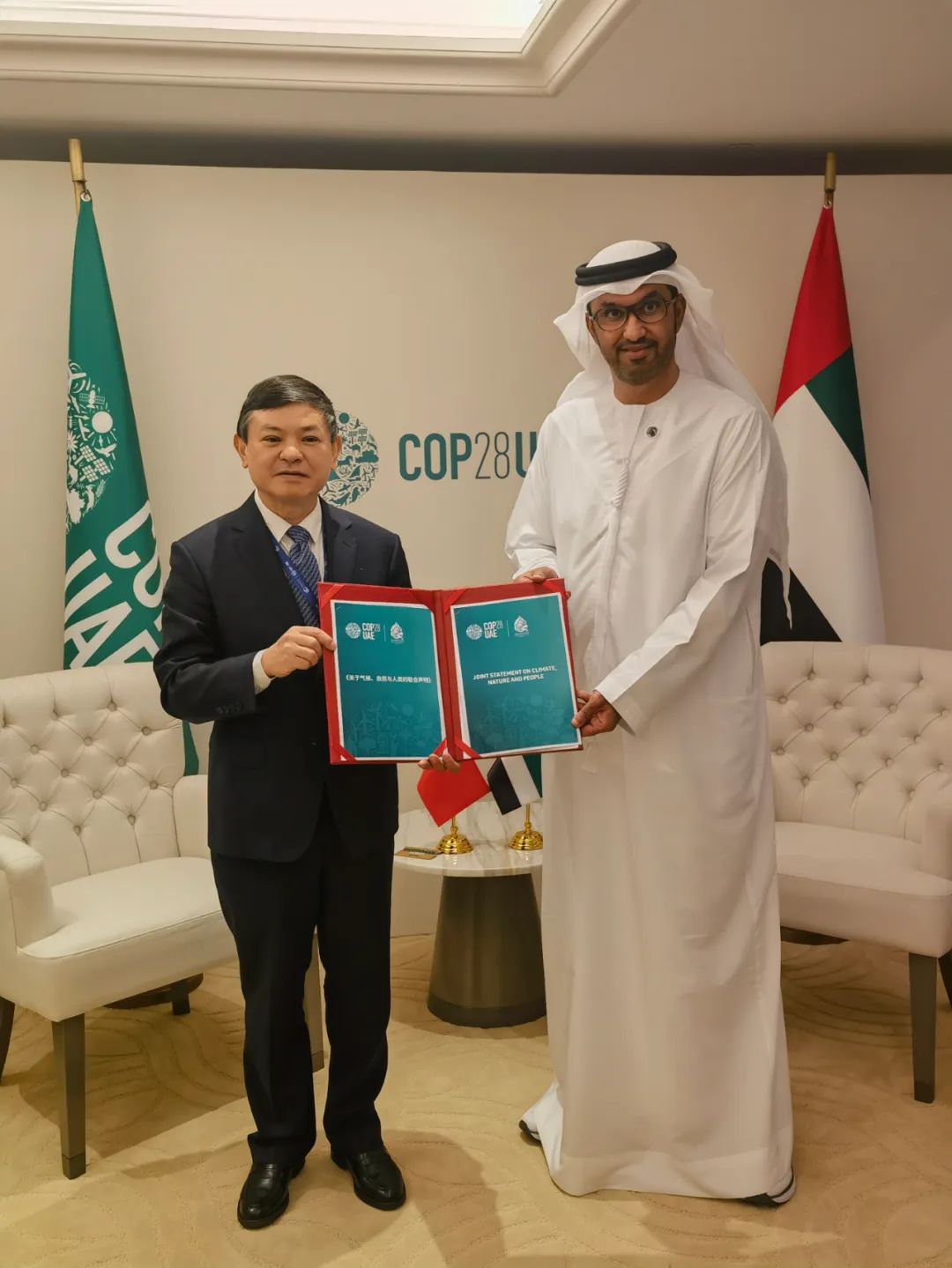 大会期间,黄润秋与COP28主席苏尔坦举行会见。黄润秋表示,中方期待COP28遵循《联合国气候变化框架公约》及其《巴黎协定》目标、原则及相关安排,聚焦行动与合作,敦促发达国家提供资金、技术及能力建设等方面支持。苏尔坦感谢中方的全力支持,表示愿与中方加强交流联系,携手推动COP28取得成功。