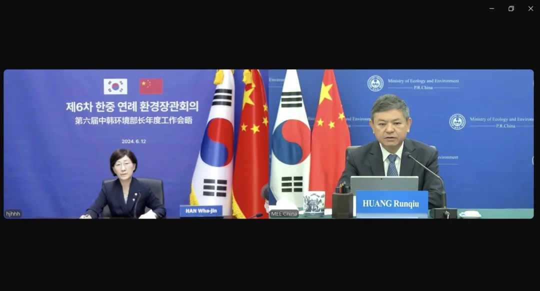 6月12日,中韩环境部长2024年度工作会晤以视频方式举行。生态环境部部长黄润秋和韩国环境部部长韩和真出席会议。双方就大气污染防治、生物多样性保护、塑料污染治理等议题进行深入交流。