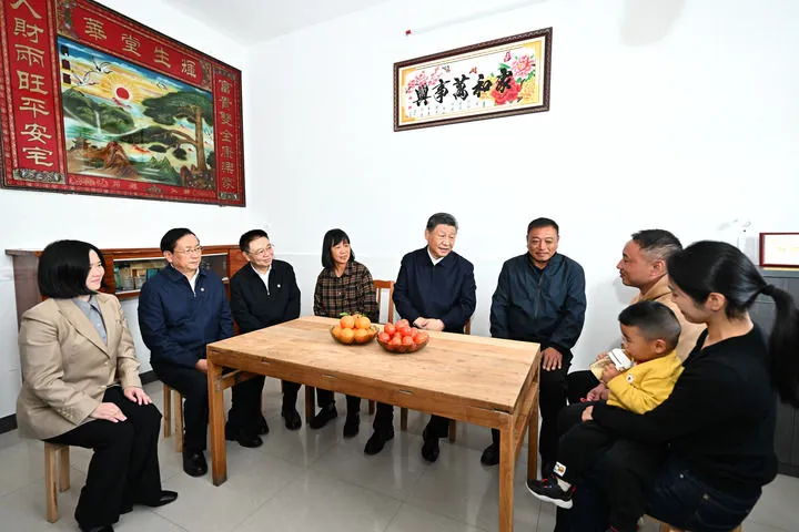 11月4日至6日,中共中央总书记、国家主席、中央军委主席习近平在湖北考察。这是5日上午,习近平在咸宁市嘉鱼县潘家湾镇四邑村村民熊成龙家,同一家人围坐在一起拉家常。新华社记者 燕雁 摄