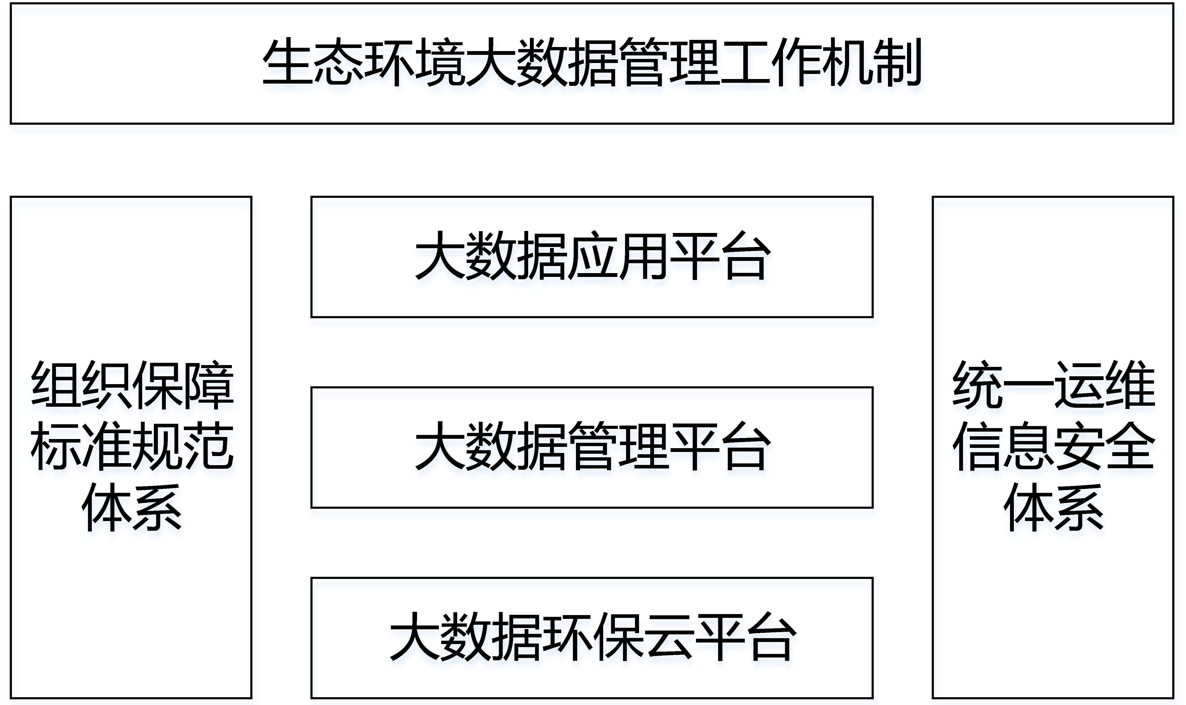 生态环境大数据总体架构为“一个机制、两套体系、三个平台”。一个机制即生态环境大数据管理工作机制,两套体系即组织保障和标准规范体系、统一运维和信息安全体系,三个平台即大数据环保云平台、大数据管理平台和大数据应用平台。如下图所示: