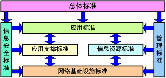 根据对各分体系的内容和作用的说明可以看出,总体标准分体系处于整个体系的最上位,它为下位的其他六个分体系提供总体指导和机制保障;网络基础设施标准分体系为应用支撑标准分体系、信息资源标准分体系和应用标准分体系提供实现其功能的网络设备和工具;应用支撑标准分体系和信息资源标准分体系为应用标准分体系提供规范化的数据以及交换和目录服务,从而为实现其功能提供基础;信息安全标准分体系和管理标准分体系贯穿于网络基础设施标准分体系、信息资源标准分体系、应用支撑标准分体系和应用标准分体系之中,为这四个分体系提供安全保障和管理制度保障,从而确保环境信息化建设的正常运行。环境信息化标准体系框架的各分体系之间的逻辑关系如图2所示。