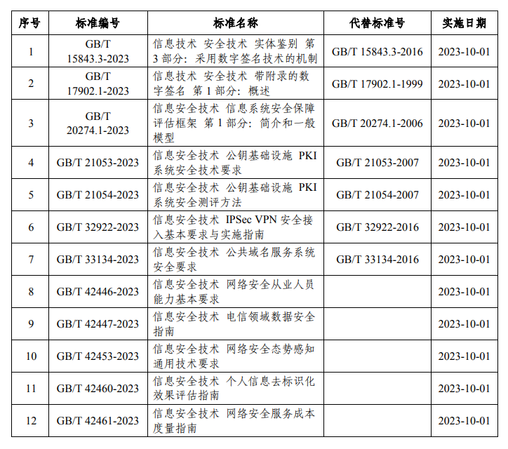 根据2023年3月17日国家市场监督管理总局、国家标准化管理委员会发布的中华人民共和国国家标准公告(2023年第1号),全国信息安全标准化技术委员会归口的12项网络安全国家标准正式发布。具体清单如下: