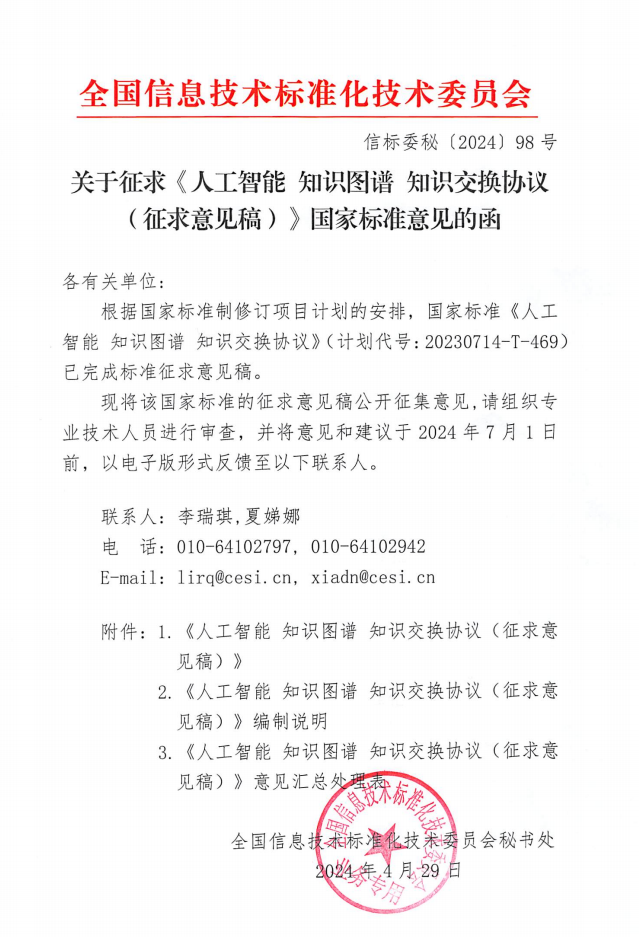 关于征求《人工智能 知识图谱 知识交换协议(征求意见稿)》国家标准意见的函