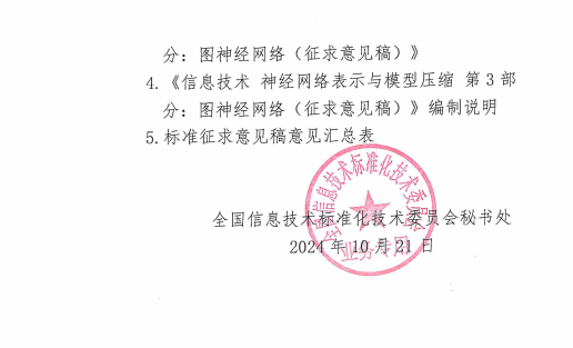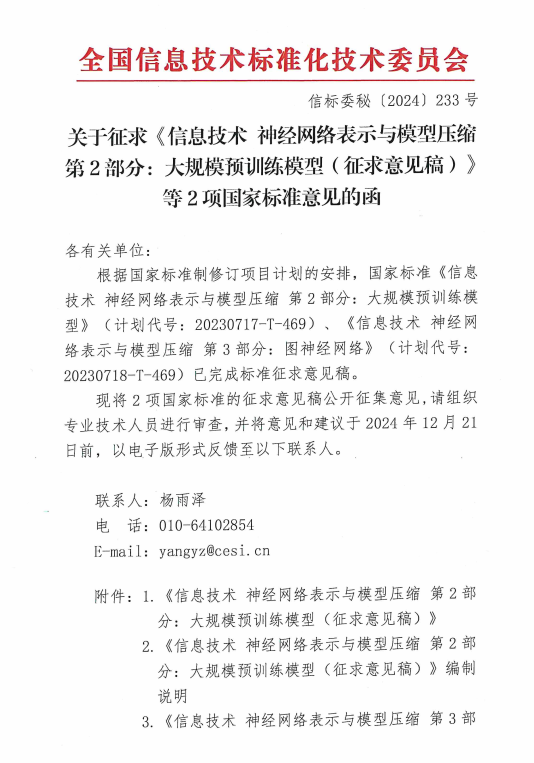 关于征求《信息技术 神经网络表示与模型压缩 第2部分:大规模预训练模型(征求意见稿)》等2项国家标准意见的函