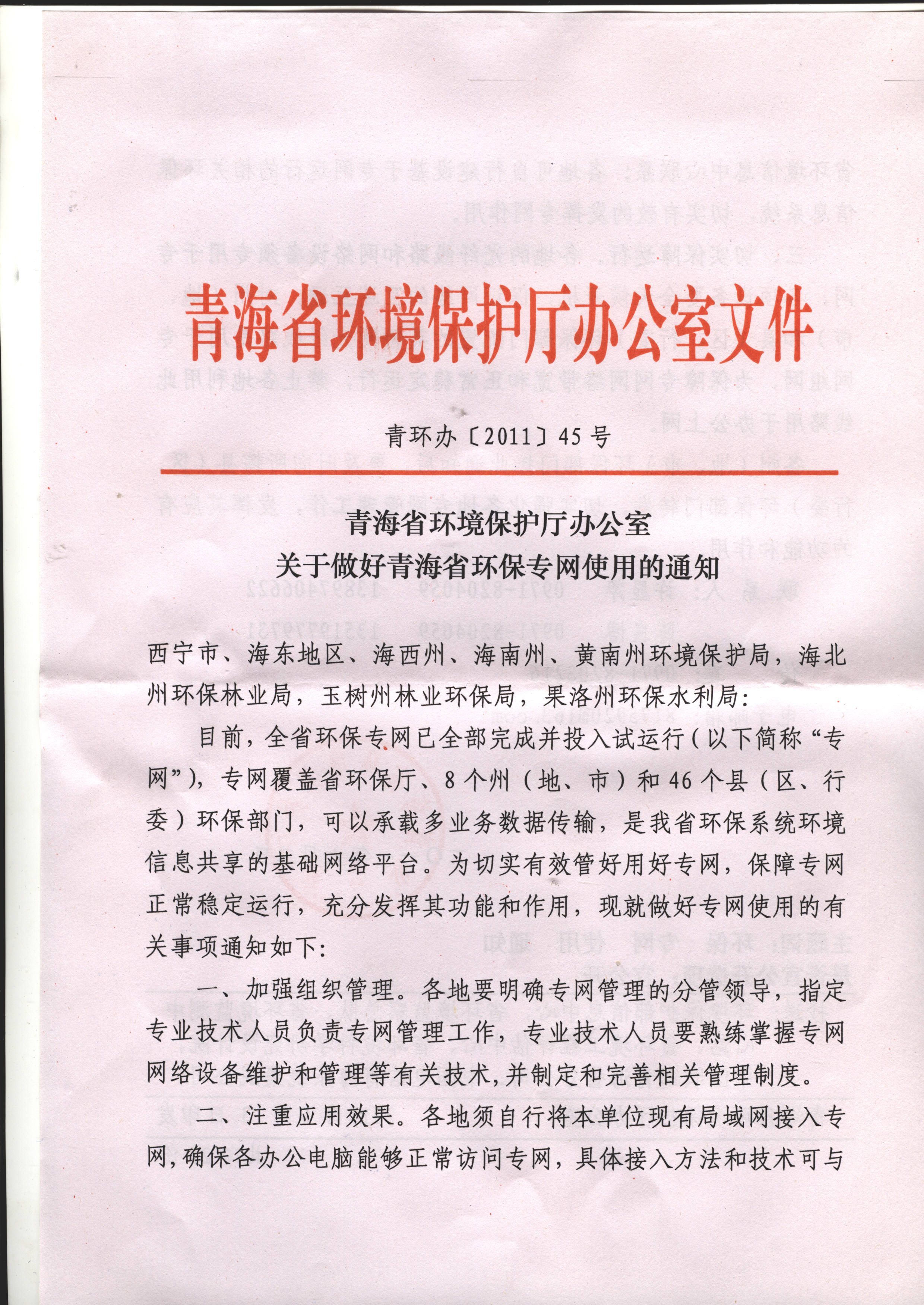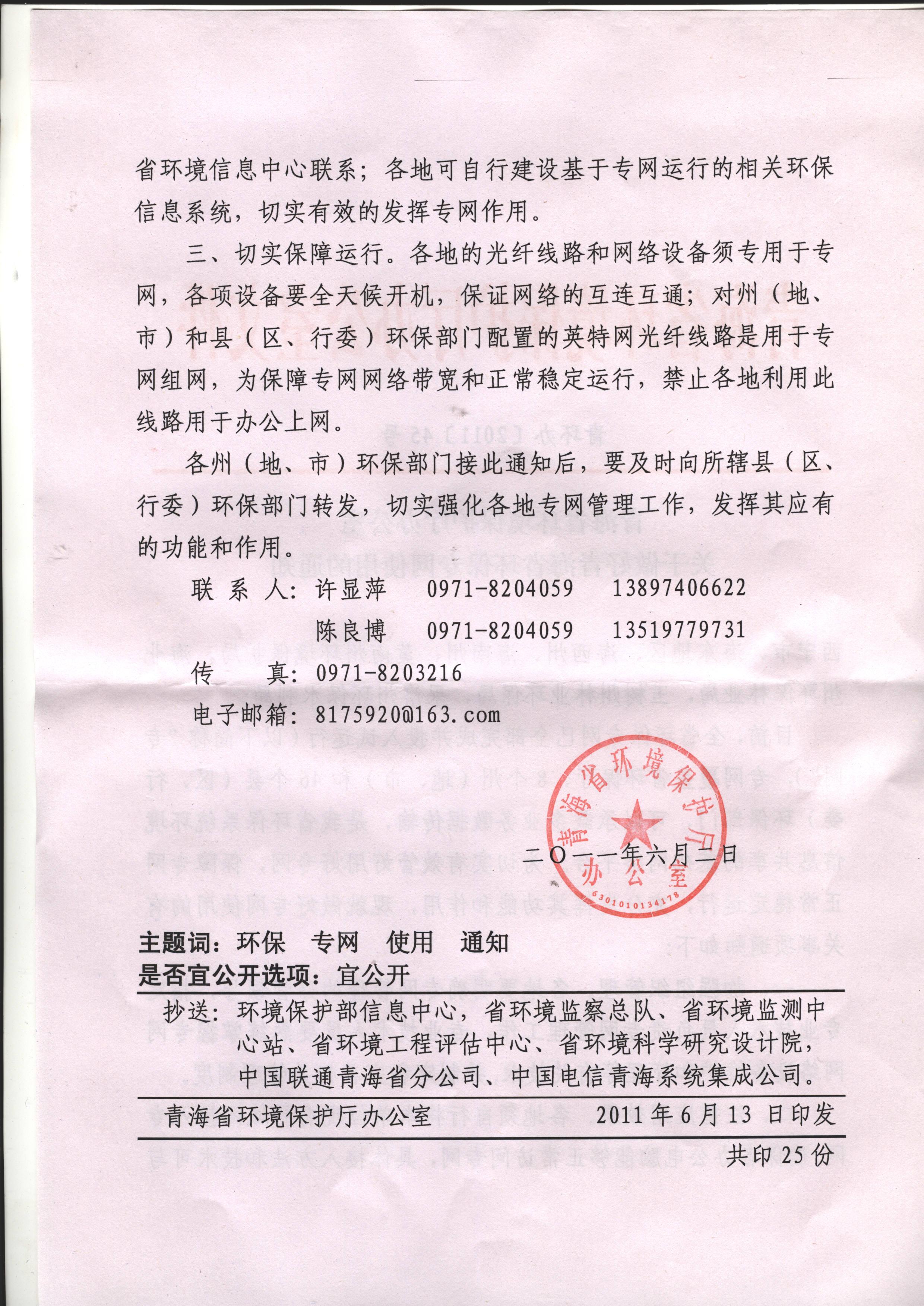 青海省环境保护厅办公室关于做好青海省环保专网使用的通知