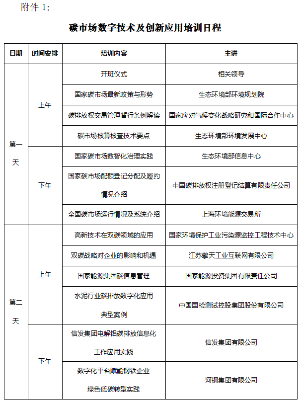 国家碳市场最新政策与形势、碳市场数字化典型案例分享,主要培训日程见附件1。
