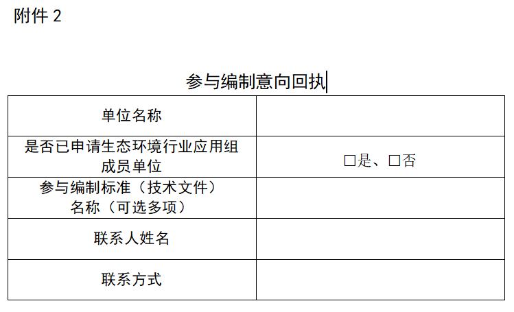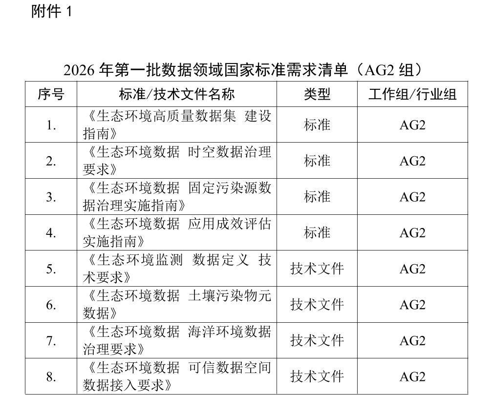 全国数据标准化技术委员会发布2026年第一批数据领域国家标准需求清单(以下简称需求清单),其中由生态环境部信息中心作为组长单位的生态环境行业应用组(AG2组)有8项国家标准和技术文件列入需求清单(详见附件1)。为做好上述标准和技术文件的编制,现面向各单位广泛征集生态环境行业应用组成员单位及参编单位,请有意愿的单位于2026年4月24日前,完成全国数标委成员单位申请及申请参加行业应用组操作(详见《关于发布2026年第一批数据领域国家标准需求的通知》,链接:https://www.nda.gov.cn/sjj/zwgk/tzgg/0410/20260410211223651215762_pc.html),并发送“参与编制意向回执”(详见附件2)到yuelongkai@chinaeic.net。