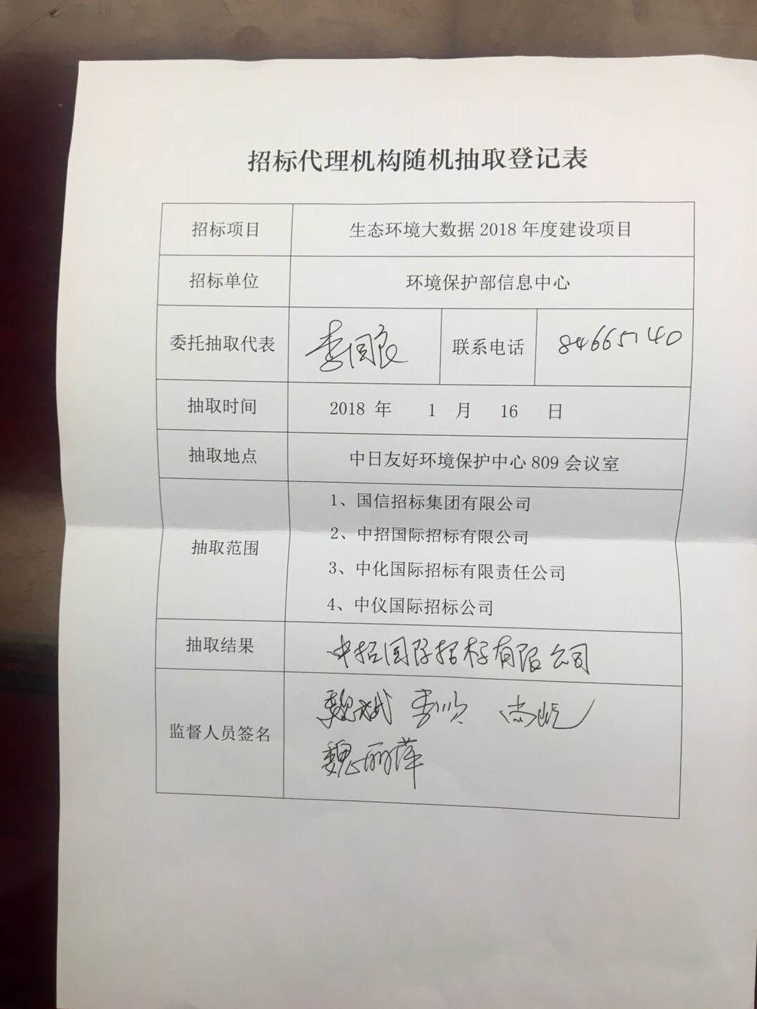 2018117日上午,信息中心在中日中心809会议室开展了生态环境大数据2018年度建设项目招标代理机构抽取工作。根据规财司2009-2011采购代理合作机构清单,李国良抽取中招国际招标有限公司作为2018年度项目的招标代理机构。魏斌总工、李顺、尚屹、魏丽萍监督了抽取过程。
