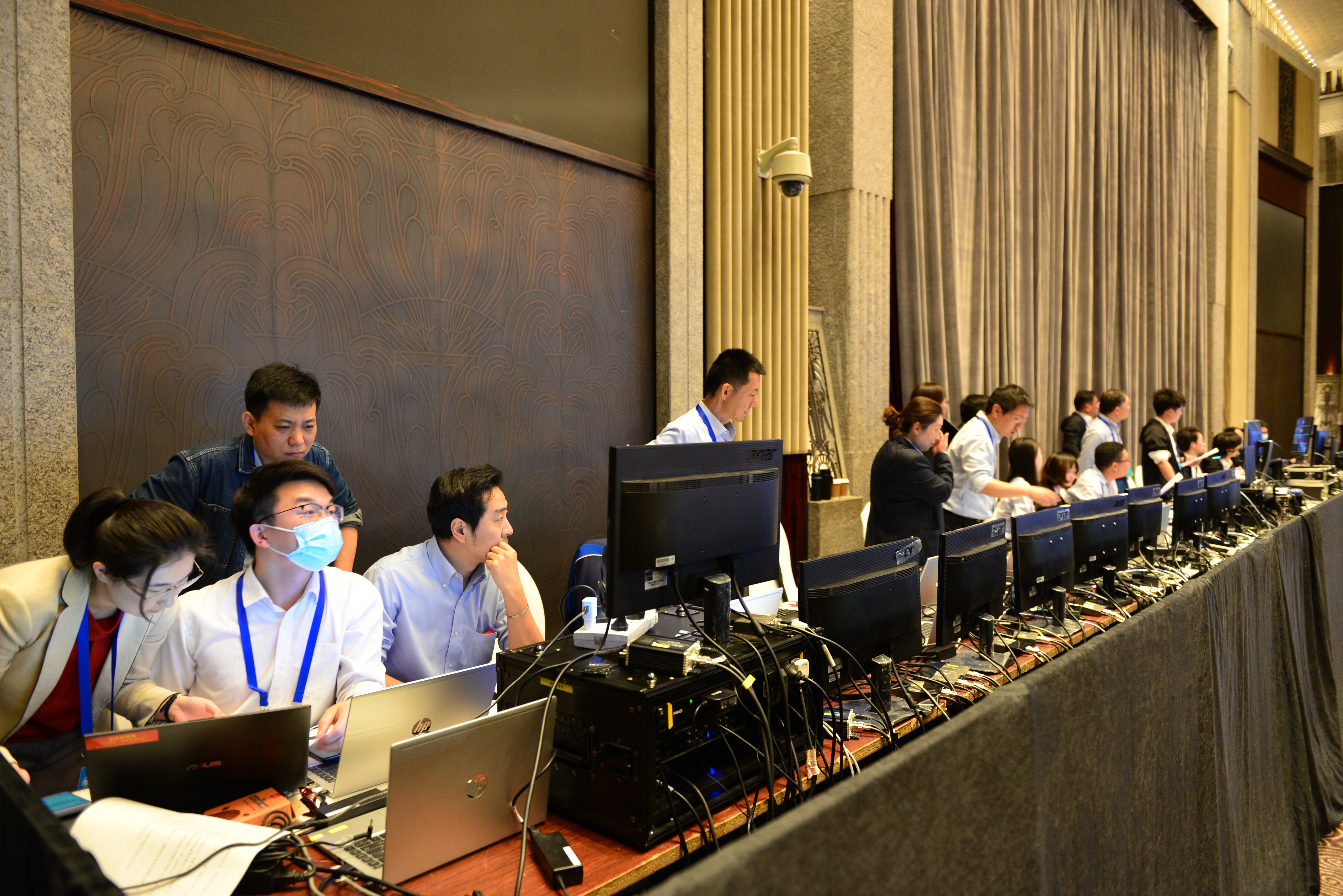 本次会议由生态环境部COP15执委办进行总指导,信息化组负责视频会议等关键技术保障。信息化组在中心主任章少民的领导下,由中心副主任杨子江现场指挥,安全运维室梁京负责网络连接、音视频传输、信号切换等技术工作,是整个线上会议的核心保障工作组。