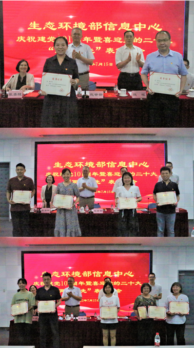会议宣读了《关于表彰2022年生态环境部优秀共产党员、优秀党务工作者和先进党组织的决定》《关于表彰2022年信息中心先进党组织、优秀共产党员、优秀党务工作者的决定》,中心领导分别为获奖集体和个人颁奖。4位获表彰代表结合工作实际作了典型发言。