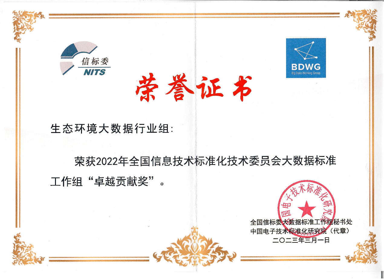 2023年3月9日,“2023全国大数据标准化工作会议暨全国信标委大数据标准工作组第九次全会”在广州召开。信息中心作为生态环境大数据标准行业组(以下简称“生态环境行业组”)组长单位,荣获2022年度全国信息技术标准化技术委员会(以下简称“全国信标委”)大数据标准工作组卓越贡献奖。