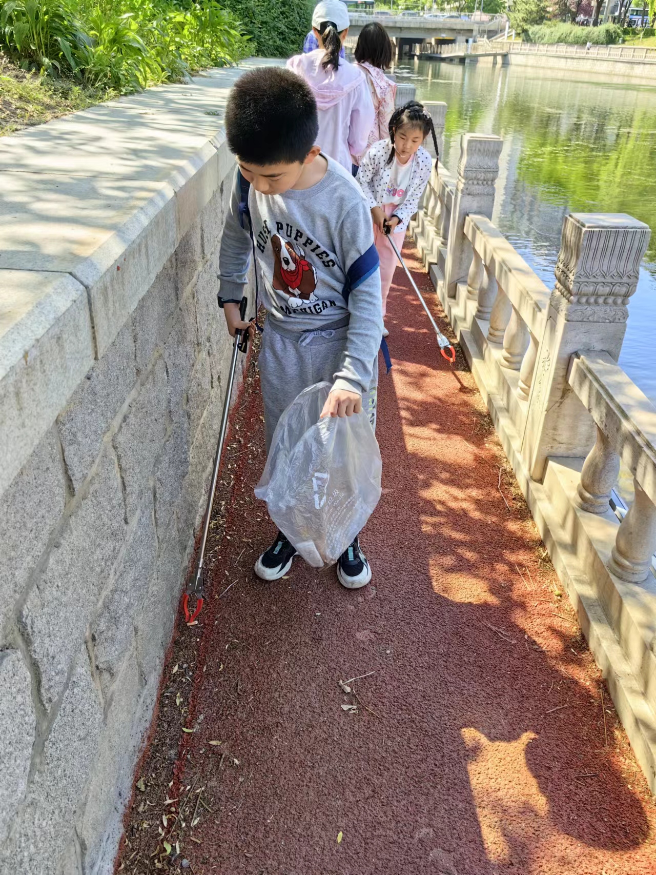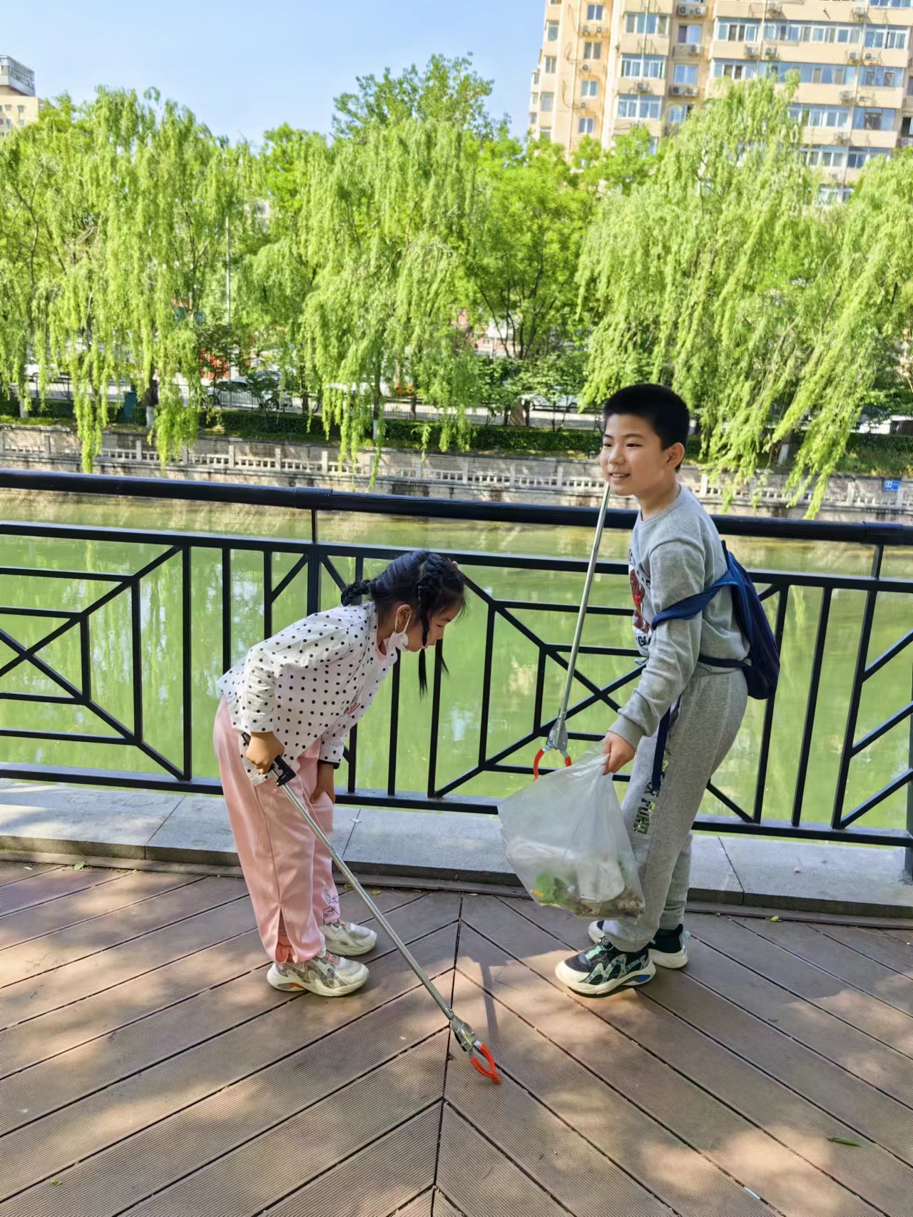 2023年5月7日,张嘉祺和张方宁小朋友参加了西城区白云观社区“美丽河湖”志愿服务活动。两位小朋友拿着垃圾夹和塑料垃圾袋认真捡垃圾的可爱模样,不正是下一代环保人对这个城市生态环境纯真而深沉的爱吗?