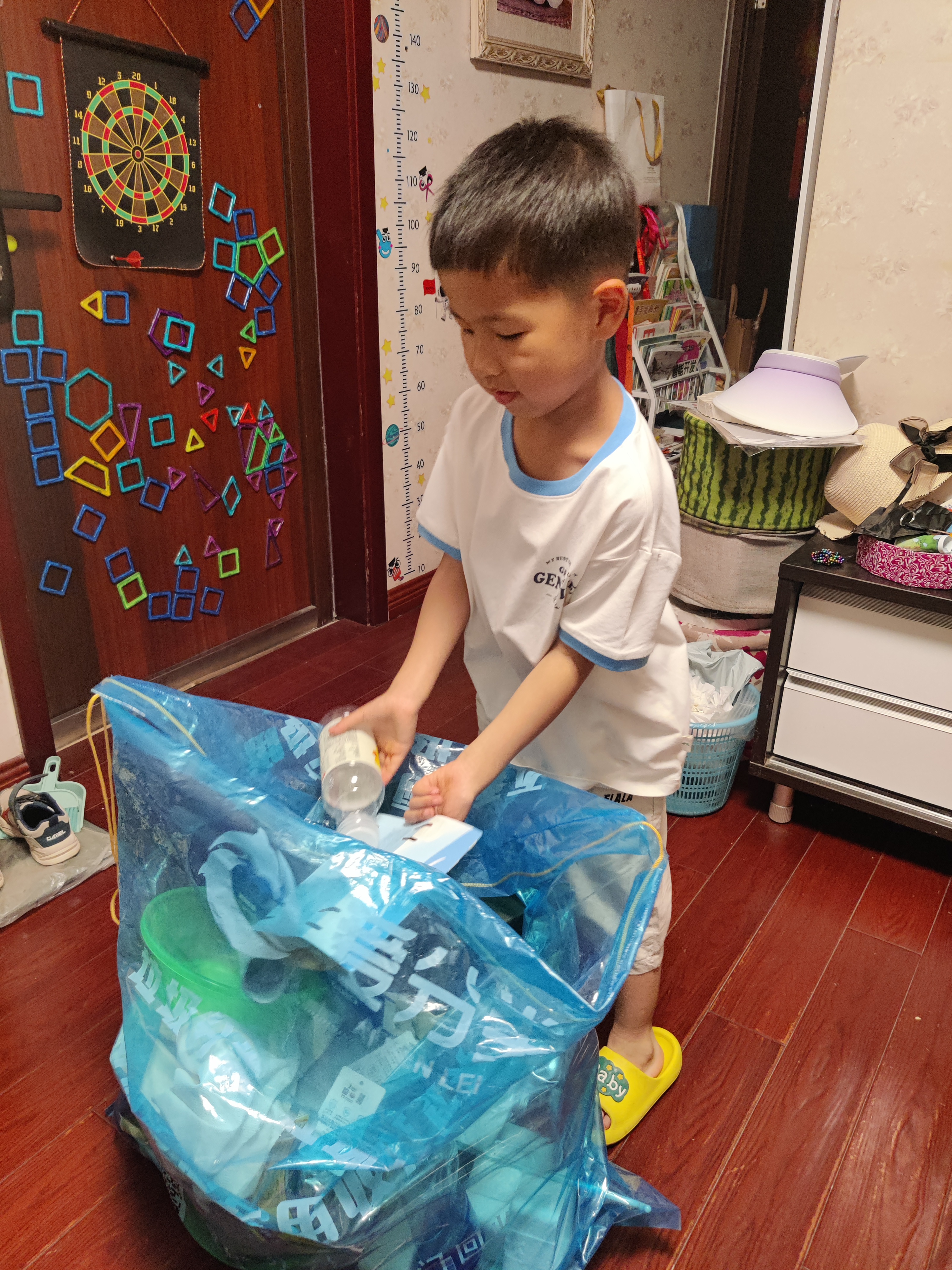 家里有分类回收袋,我们会告诉孩子,哪些不要的东西可以放进袋子里,等袋子满了就会有叔叔上门把袋子拿走,我们能得到环保币,环保币可以换我们想要的东西,平时,孩子能主动把废纸、泡沫、快递盒、塑料瓶等可回收物放进袋子,有时候我把一些可回收物扔进垃圾桶,孩子也会指正我说,妈妈这些东西可以卖钱,很欣喜这种方式培养了孩子较强的环保意识。