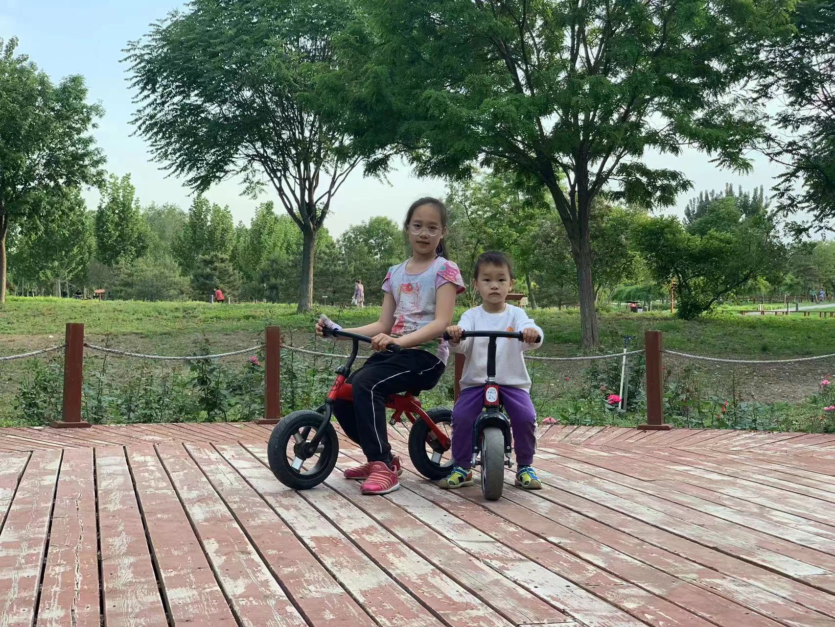 绿色健康生活,低碳环保出行。2023年5月,郑润九和郑闰之姐弟俩在通州马驹桥凉水河公园感受骑行乐趣。