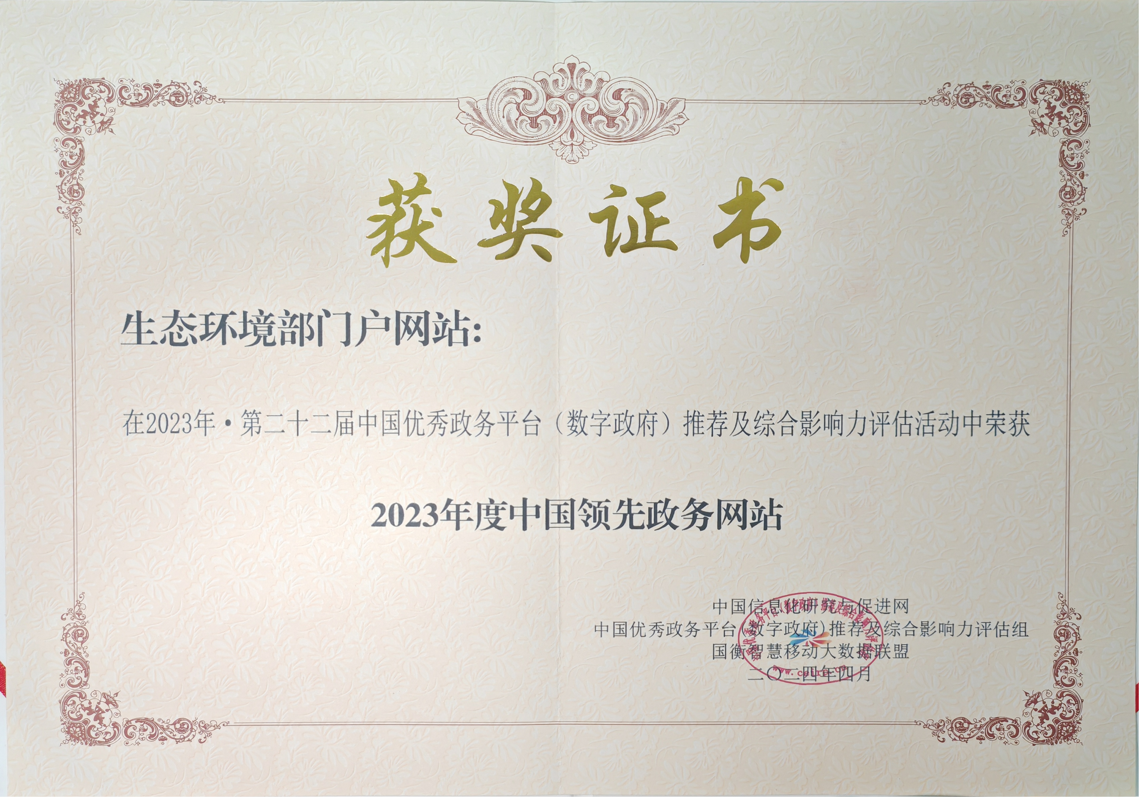 生态环境部门户网站荣获“2023年度中国领先政务网站”称号