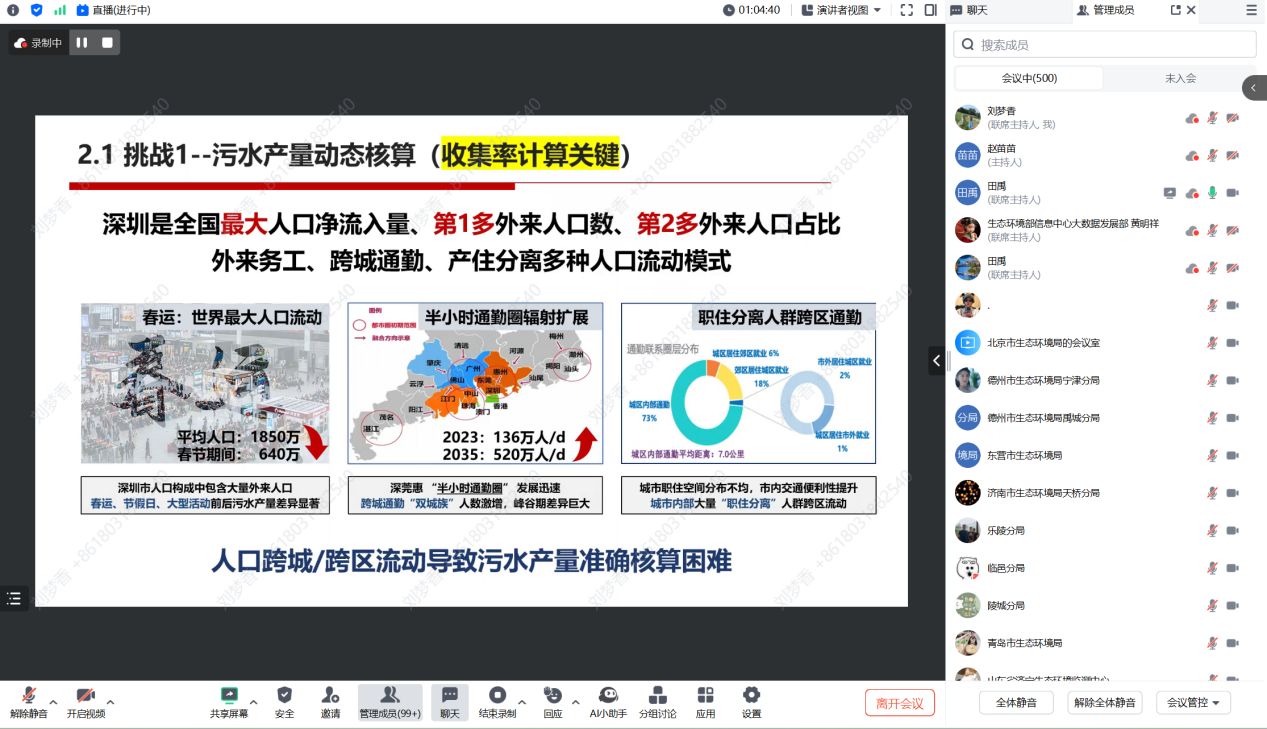 田禹教授以深圳观澜河流域治理为典型案例,详细讲解了区域排水系统智慧化管控的方法与实践。她指出,当前排水系统正经历从监测传感到人工智能、从自动化到智慧化的全面升级。面对污水产量动态核算的不确定性和管网外水入侵等严峻挑战,田禹教授提出了居民生活产污精细化统计的新方法,并展示了基于低门栏大数据驱动的自主模型组群在预警预报、工单流转和异常数据溯源等方面的实际成效。与会人员围绕大模型构建、人工智能在生态环境方面的应用等提出问题并热烈讨论。