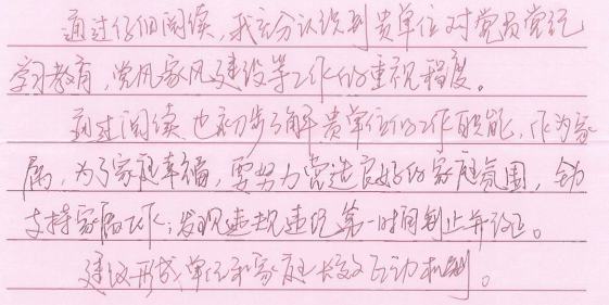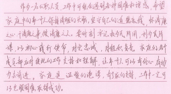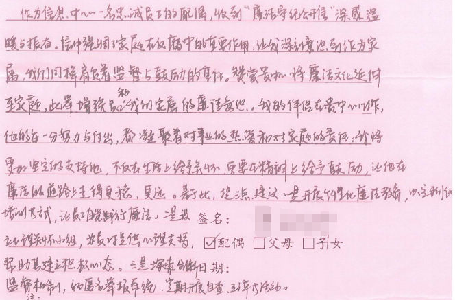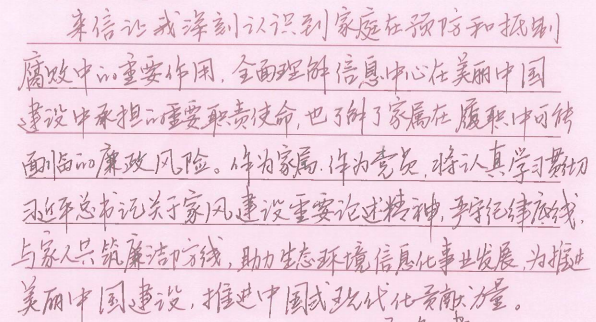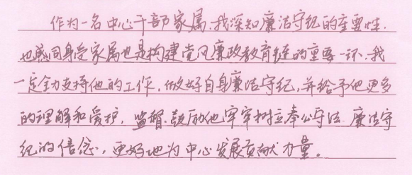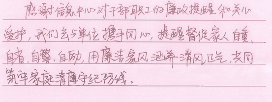 此次活动得到广大干部职工和家属同志们的一致认可和积极回应。“廉则安、安则馨、馨则福”“信息中心高度重视廉洁家风建设,及时印发提醒公开信,是对我们家庭的爱护”“作为一名干部家属,我们一定全力支持他的工作,做好自身廉洁守纪,并给予他更多理解和爱护,监督鼓励他牢牢树立奉公守法、廉洁守纪的信念,更好地为中心发展贡献力量”……一封封回执不仅表达了对中心工作的理解支持和配合,以及对身边亲人的关怀、期望和祝福,更是家属同志们积极参与共同监督的助廉表态和承诺。
